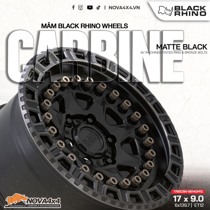 Là mẫu mâm monoblock mạnh mẽ như các dòng xe đua thể thao, Black Rhino Carbine với 8 chấu cổ điển và vòng bên ngoài được trang trí thêm những con ốc màu đồng tạo thêm điểm nhấn – mang lại cho chiếc xe của bạn sự pha trộn giữa phong cách chiến binh nhưng cũng đầy tinh tế.